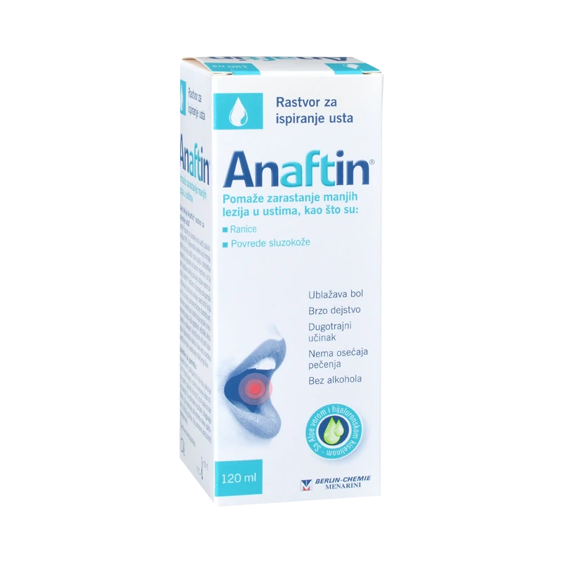 Anaftin rastvor 120 ml pomaže u zarastanju manjih lezija u ustima kao što su afte i povrede sluzokože. Ublažava bol i nema osećaja peckanja.