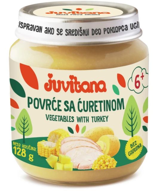 Juvitana Kašica od povrća sa ćuretinom sadrži kombinaciju povrća i najkvalitetnijih delova ćurećeg mesa. Pored vitamina, minerala i dijetnih vlakana, obezbeđuje i belančevine neophodne za rast i razvoj bebe. Namenjena je deci starijoj od 6 meseca.