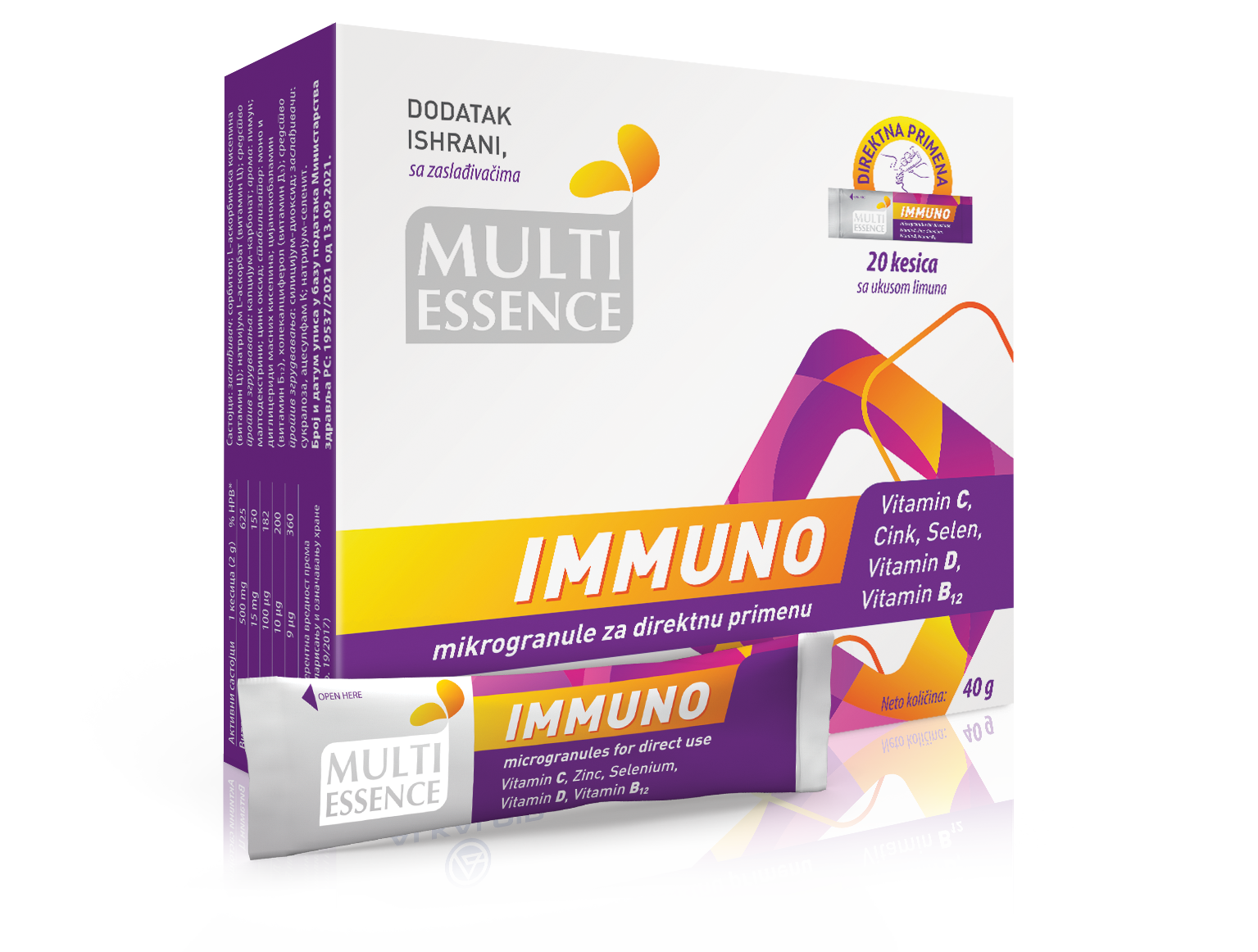 MULTI ESSENCE IMMUNO predstavlja dodatak ishrani u obliku kesica za direktnu primenu, prijatnog ukusa limuna. Mikrogranule za direktnu primenu MULTI ESSENCE IMMUNO obezbe?uju potrebnu koli?inu vitamina i minerala, u cilju zadovoljavanja pove?anih potreba