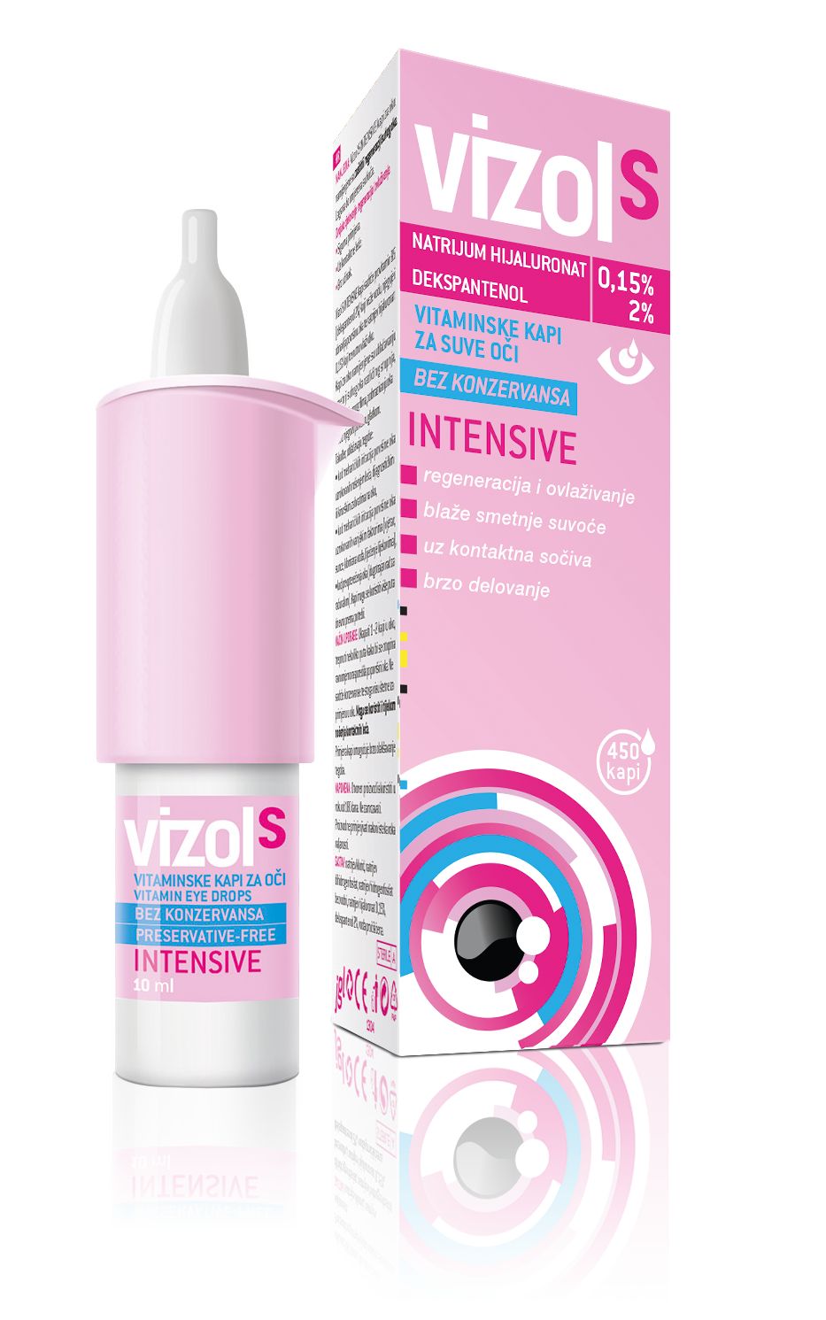 Vizol S INTENSIVE kapi za oči namenjene su ublazavanju smetnji suvog oka različitog stepena, stabilizaciji suznog filma, podmazivanju oka čineći njegovu površinu glatkom.